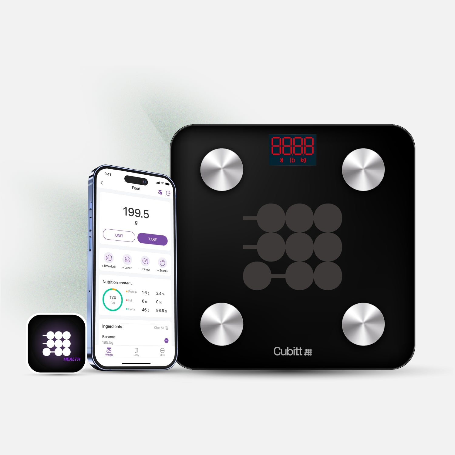 Alcanza tus objetivos de salud con nuestra completa aplicación de báscula inteligente. Comprende el valor nutricional de tus comidas con la Báscula de Cocina Cubitt.